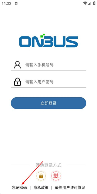 1、在ONBUS登录页面点击忘记密码选项,进入找回密码页面。