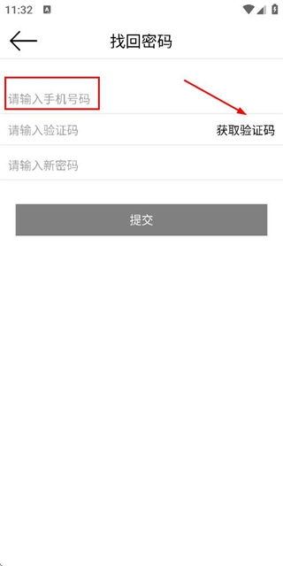 2、在找回密码页面输入手机号码后,点击获取验证码按钮。