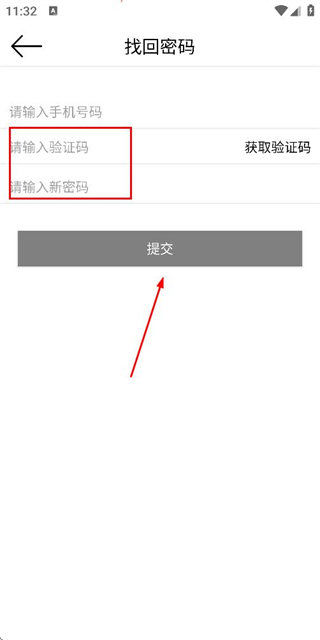 3、在找回密码页面填写验证码和新密码后,点击提交按钮完成密码找回。