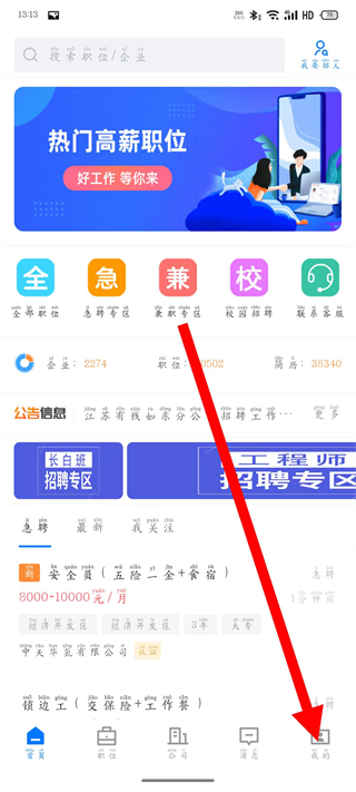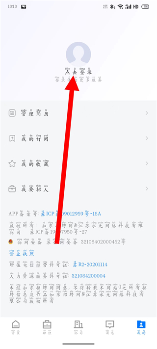 1、在如东招聘网首页,点击底部我的按钮,进入个人页面。