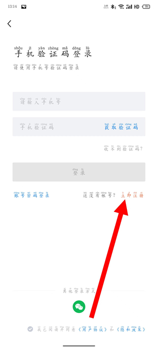 3、在手机验证码登录页面,点击立即注册,进入身份选择页面。