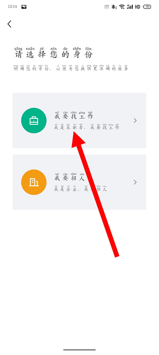 4、在身份选择页面,点击我要找工作选项,进入注册页面。