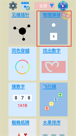 1、进入游戏主界面,选择带【NEW】标识的【物理弹球】模式,开启弹射消除的休闲挑战。