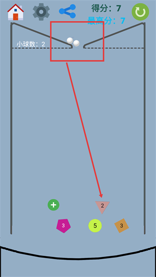 2、发射【2】颗小球撞击下方数字块,优先瞄准【2】的区域,触发消除提升初始得分。