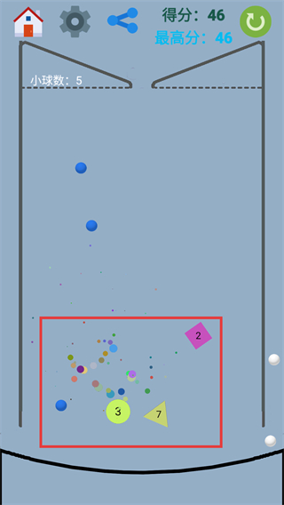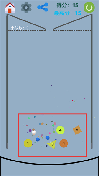 3、操控【3】颗小球弹射,利用物理反弹撞击多色数字块,同数字消除累计更高分数。