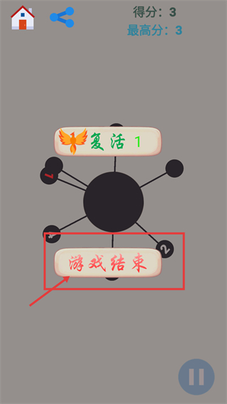 4、游戏推进后【得分-3】,出现红框标注的【游戏结束】按钮,点击该按钮可结束本局,也可选择【复活1】继续游玩。