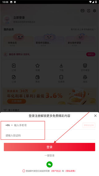 3、在下方弹出登录方式,输入手机号、验证码再点击登录。