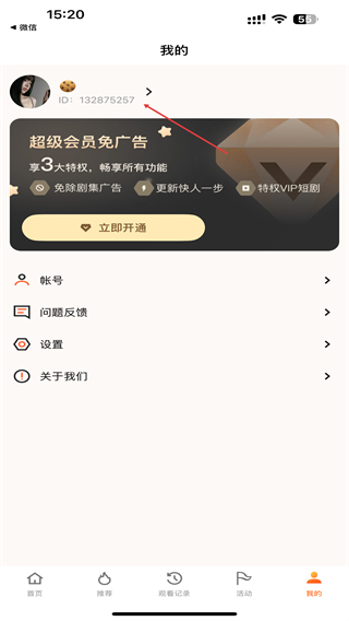 2、在我的页面中,点击显示账号ID的区域,进入账号设置页面。