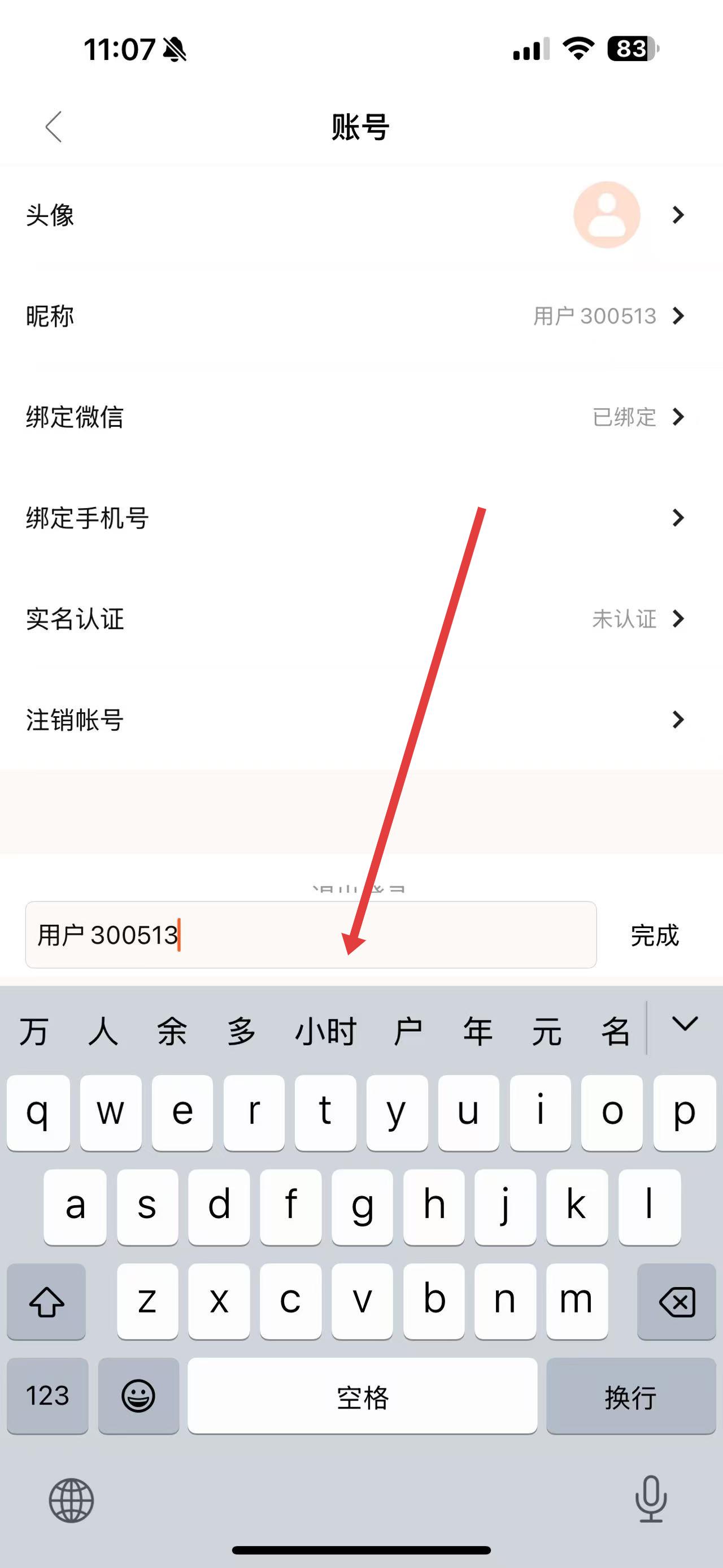 4、点击昵称选项,在弹出的输入框中删除原有昵称,输入新昵称后点击完成,即可完成昵称修改。