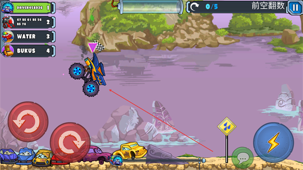 1、操控车辆在空中完成前空翻,超越对手,向赛道终点的旗帜推进。