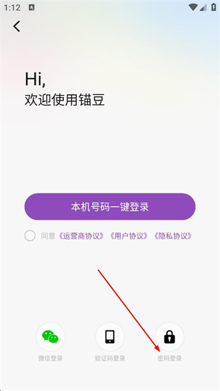 1、在锚豆欢迎页面,点击密码登录的选项,然后进入登录页面。
