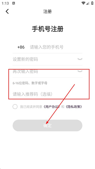 4、在注册页面,填写再次输入密码,选填推荐码,点击确定按钮完成注册。
