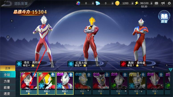 2、在团队配置页面选择要升级的奥特曼,进入其英雄界面。