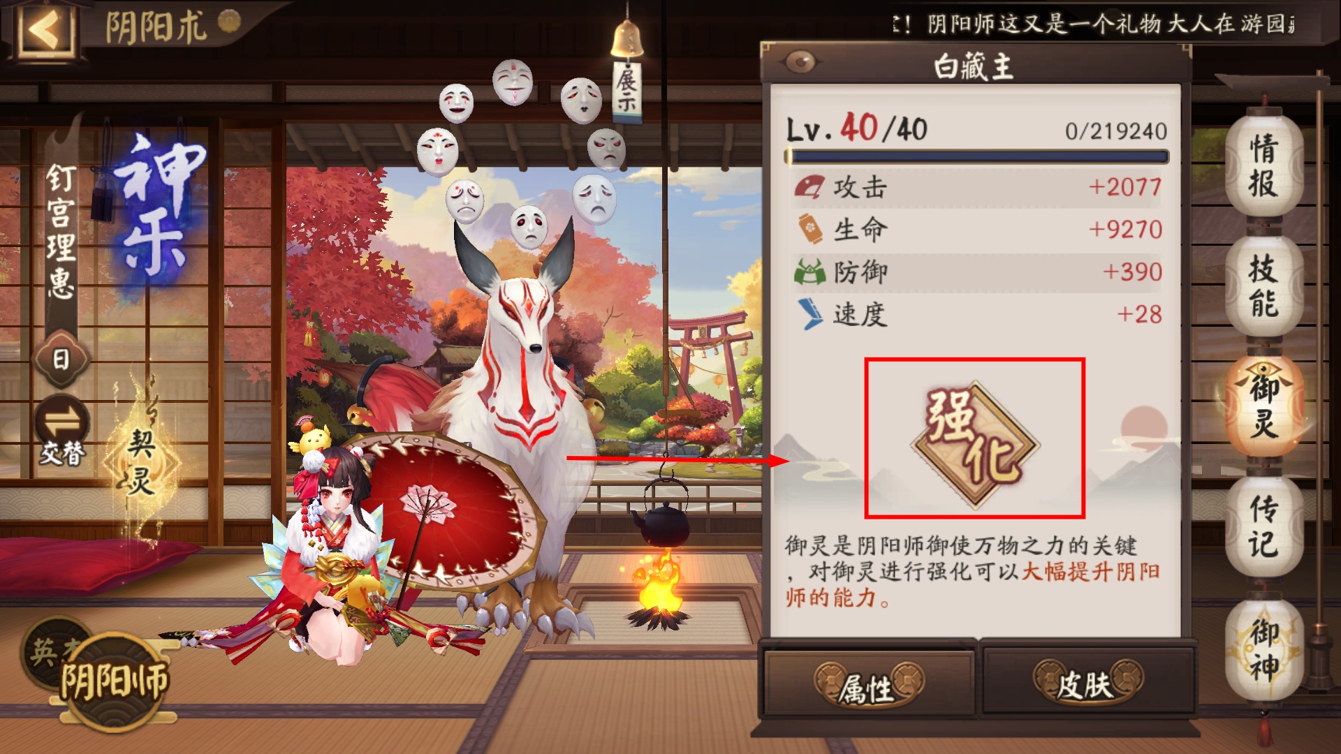 3、在【阴阳术】的御灵界面中,点击【强化】按钮可提升御灵等级,大幅增强阴阳师的综合战斗能力。