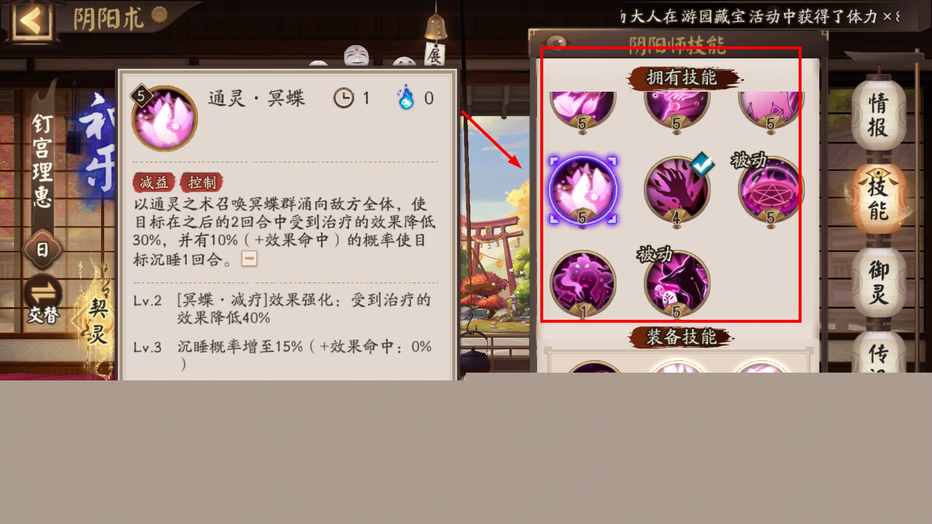 1、玩家可点击界面底部的【阴阳术】按钮,进入对应功能界面,开启后续的属性查看与御灵强化操作。