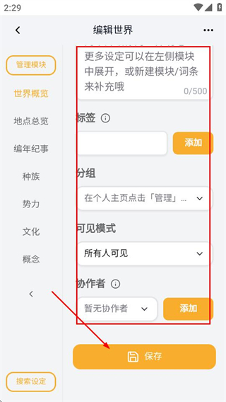 3、在编辑世界页面,填写设定信息后点击保存按钮,即可完成设置世界观。