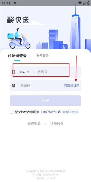 2、在登录页面填写手机号,勾选协议后,点击获取验证码。