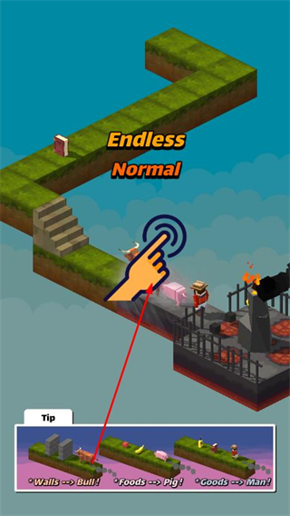 触摸屏幕可以改变人、牛和猪移动的顺序,人能捡地上的物品,猪能吃食物,牛则可以撞破墙壁。游戏有多种难度模式,还有大量不同造型的角色供玩家选择,喜欢就下载游戏吧!