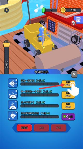 1、在【升级挖掘机】界面,消耗【2000】金币解锁“增加一个引擎”等属性,提升挖掘机的挖掘效率。