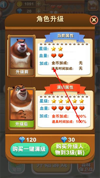 3、升级后角色的星级、血量、金币/道具加成会提升,助力游戏中获得更好表现。