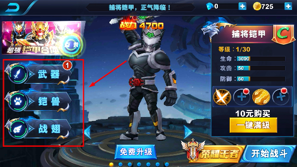 1、在角色界面选择【武器】【铠甲】【战翅】提升战力,完成免费升级后点击【开始战斗】推进游戏进程。