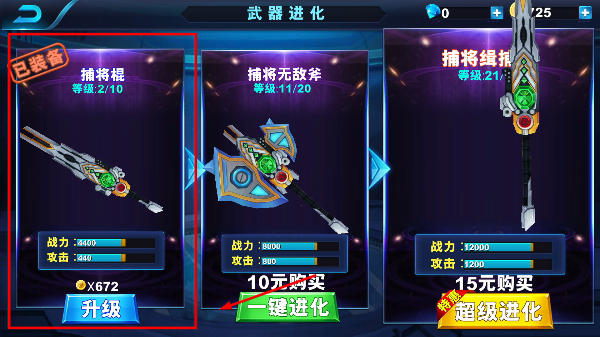 2、对已装备的【捕将棍】进行升级,积累资源后通过【一键进化】或【超级进化】提升武器战力属性。