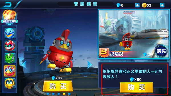 3、选择【炽焰鸡】等专属铠甲,点击购买获取后搭配装备,增强角色的综合战斗能力与属性加成。