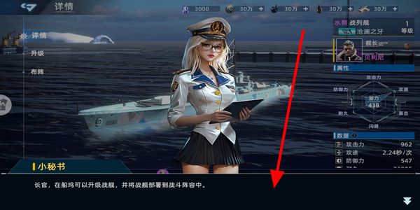 1、与小秘书对话,在船坞界面升级战舰,将战舰部署到战斗阵容中,搭配不同战舰的属性,为后续战斗做好准备。
