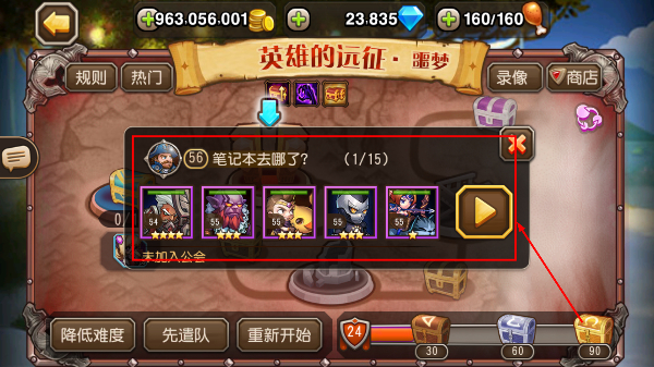 4、进入【英雄的远征-噩梦】后,查看对手【笔记本去哪了?】的阵容,调整己方英雄搭配再点击开始挑战。