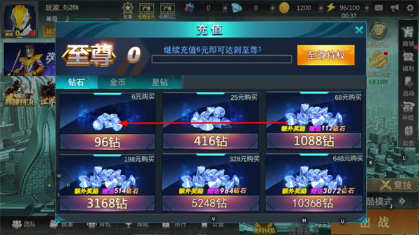 2、在充值页面选择钻石购买套餐,完成充值获取钻石。