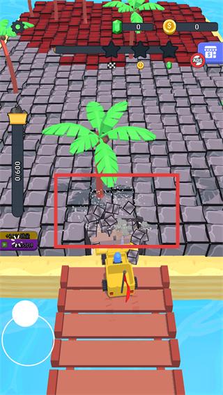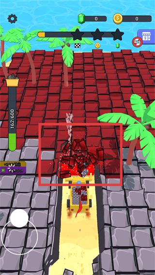 2、驾驶挖掘机靠近砖块区域,利用其挖掘功能破碎砖块,清理出前进路径,推进关卡进度。