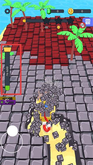 4、切换挖掘目标至红色砖块区域,破碎后可触发特效,同时快速提升进度条,加速关卡通关。