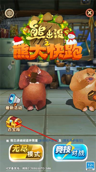 1、在熊出没之熊大快跑游戏主界面,点击百宝箱选项,进入百宝箱页面。