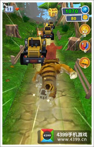 游戏操作简单,跟普通的跑酷游戏差不多,玩家只需向上滑动屏幕,便可控制熊大跑动或者跳跃,越到低障碍时,向下滑动屏幕,便可操控熊大向下滑行躲避障碍。简单的操作,玩法却充满了挑战,一路将会不断出现各种障碍,在躲避它们的同时,还要尽可能的吃到沿路的金币,但是金币虽好,可不要贪心哟,学会避重就轻才是跑酷游戏的关键,如果光想着吃金币而忽略了一路的障碍,撞击费血,那就得不偿失了。