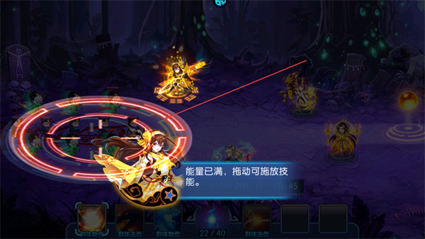 2、待能量已满,拖动角色施放技能,对敌方造成伤害,提升防御效果。
