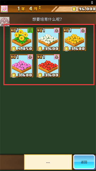 2、在培育界面选择如【向日葵】等作物,查看对应培育费用,挑选合适作物推进农场种植流程。