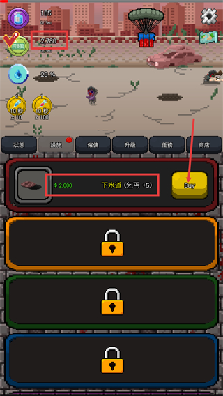 4、积累到【$2,000】后,点击【Buy】按钮解锁【下水道-(乞丐+5)】设施,该设施可增加乞丐数量,助力资源获取。