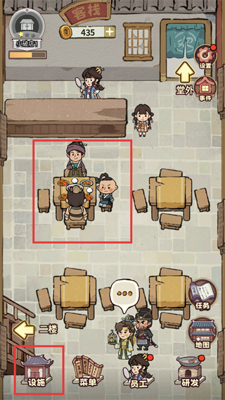 1、点击【设施】进入界面,解锁桌椅提升客栈的接待能力,为后续接待更多客人做准备。
