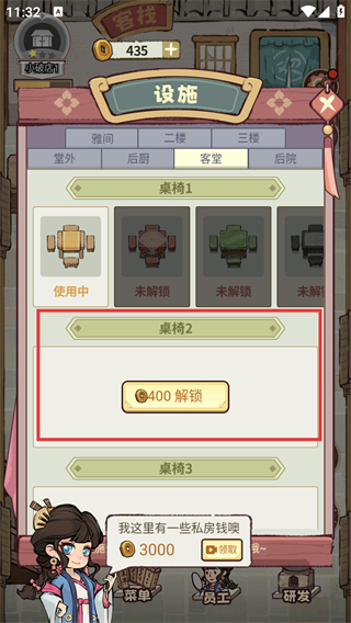2、使用客栈收益解锁【桌椅2】,增加接待客人的位置,提升客栈整体运营效率。