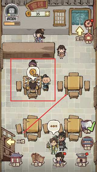 3、点击客人完成消费任务,获取【铜钱】收益,用于解锁更多设施和升级客栈功能。
