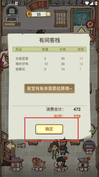 4、查看客栈账单后点击【确定】完成结算,积累的收益用于解锁更多设施提升接待能力。