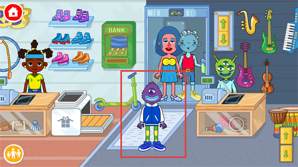 4、引导【紫色角色】离开电梯,前往周边商店区域,参与新互动内容,解锁更多场景玩法与经营机会。