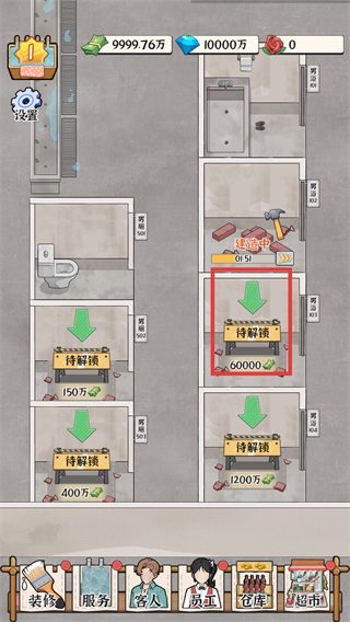 1、点击标有【待解锁】区域,推进浴场设施的建造进度,解锁新的服务区域。