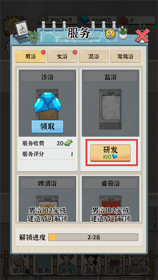 2、在【服务】界面消耗钻石点击【研发】,解锁新的洗浴服务类型,提升浴场的服务多样性。