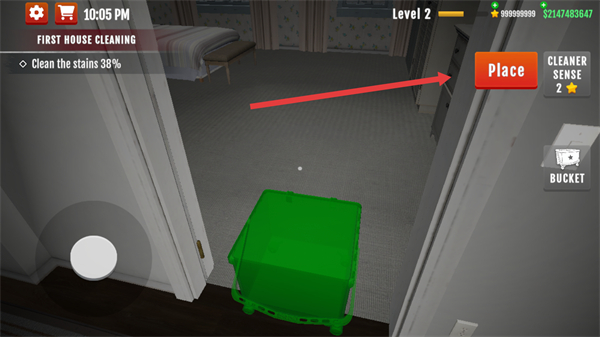 1、进入关卡后点击右侧PLACE按钮,放置清洁工具桶到合适位置。