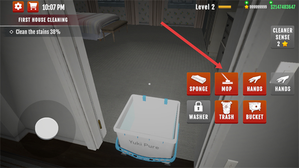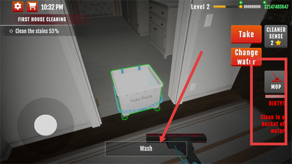 4、当拖把显示DIRTY时移动到工具桶旁,点击Wash清洗拖把继续清洁。