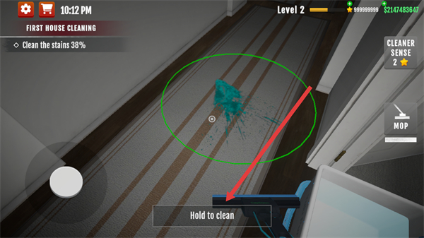 3、移动到污渍区域按住界面提示按钮,持续清洁直到污渍区域消失。