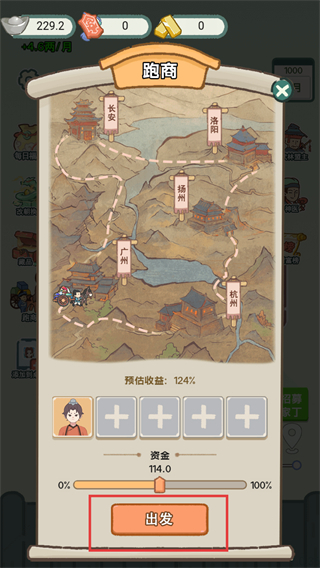 2、进入【跑商】界面,确认预估收益后点击【出发】按钮,开启跑商流程获取资源收益。