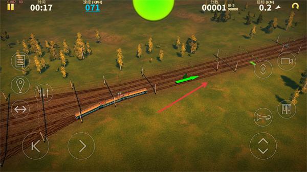 3、跟随轨道上的绿色箭头指引,调整火车行驶方向,保持车速稳定推进。