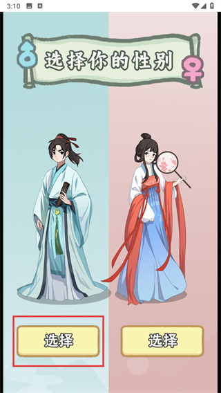 1、在性别选择界面,点击对应角色下方的【选择】按钮,确定角色性别后开启穿越剧情。